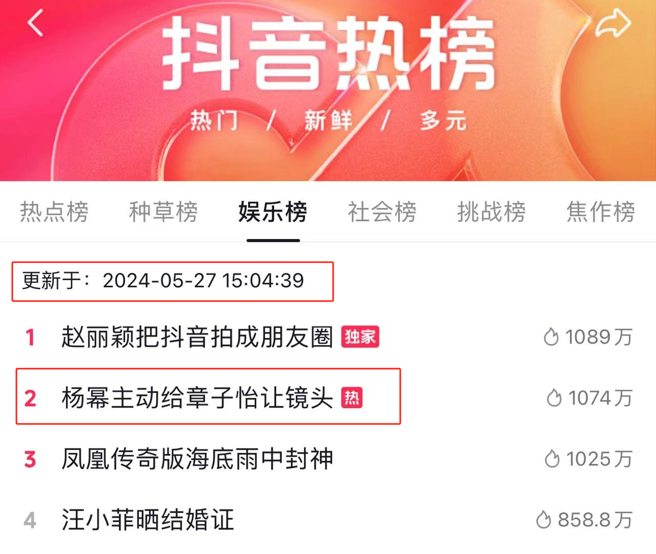 而就在5月27日的工夫,杨幂又因为一则名为“主动给章子怡让镜头”的词条冲上了热搜。