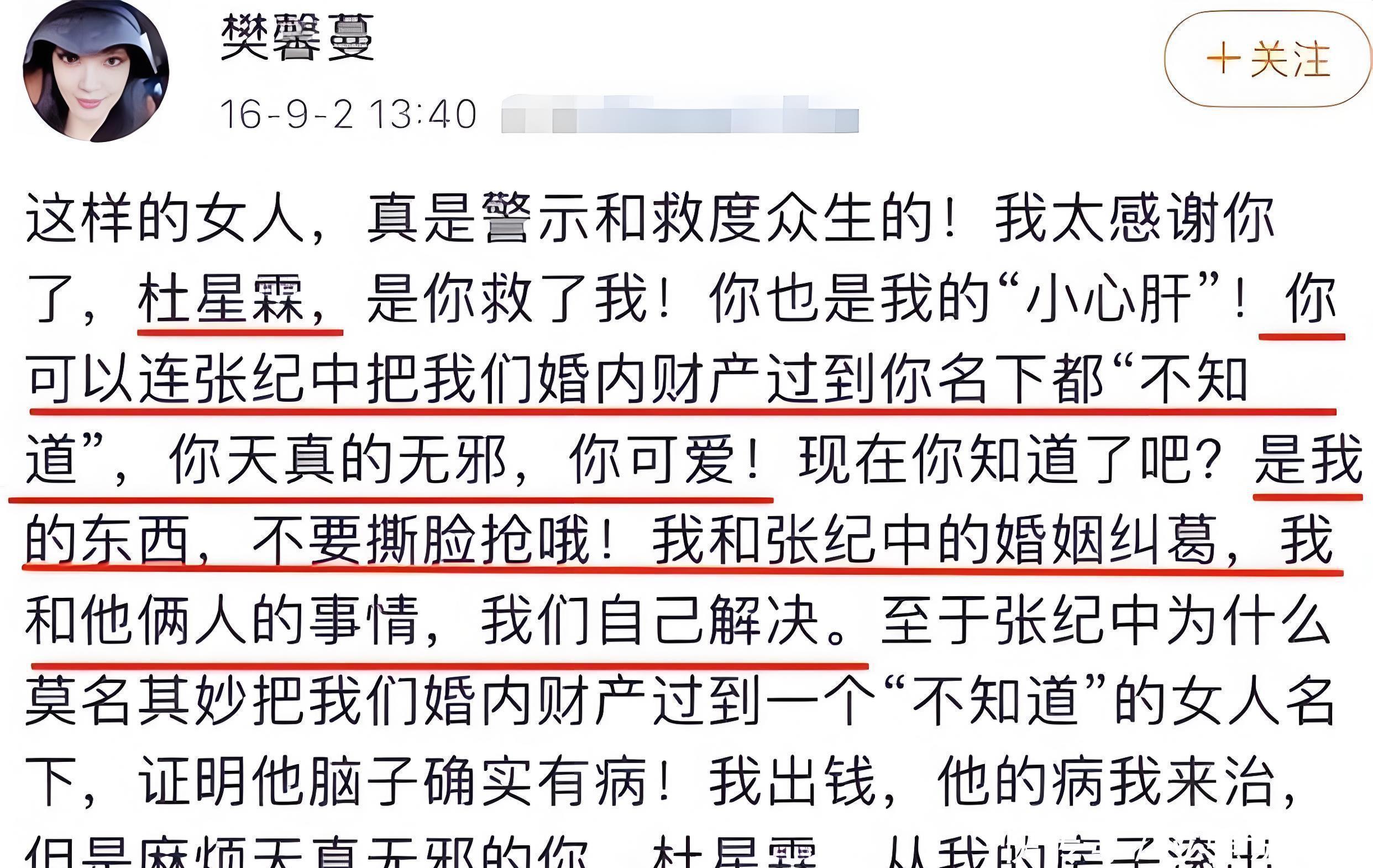 樊馨蔓于还也曾微博上流毒前夫张纪中,指控张纪中在婚配时间出轨除外还涉嫌财富调度,宣称“仳离历程汉文化、调度、房产及股票资金总和不低于3亿”。但张纪中即在微博上公开回话,暗示“两个成年东谈主自发完了的仳离公约,何来调度之说?”